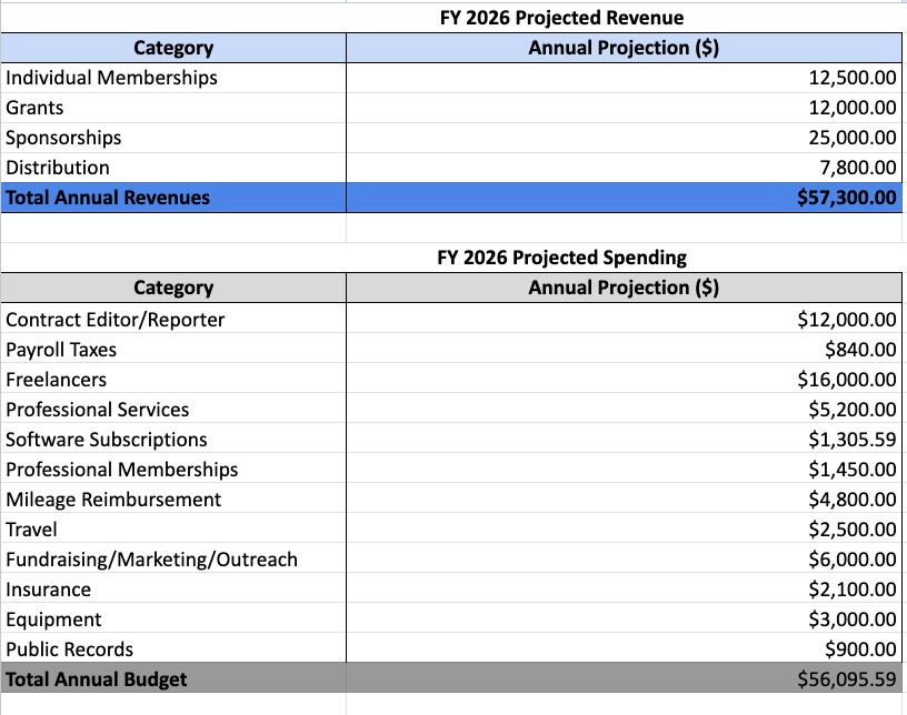 Mendo Local Public Media was launched on a budget of just $3,400, but keeping MendoLocal.News running in 2026 will take considerably more. We’re sharing our 2026 budget and will be providing budget updates throughout the year.