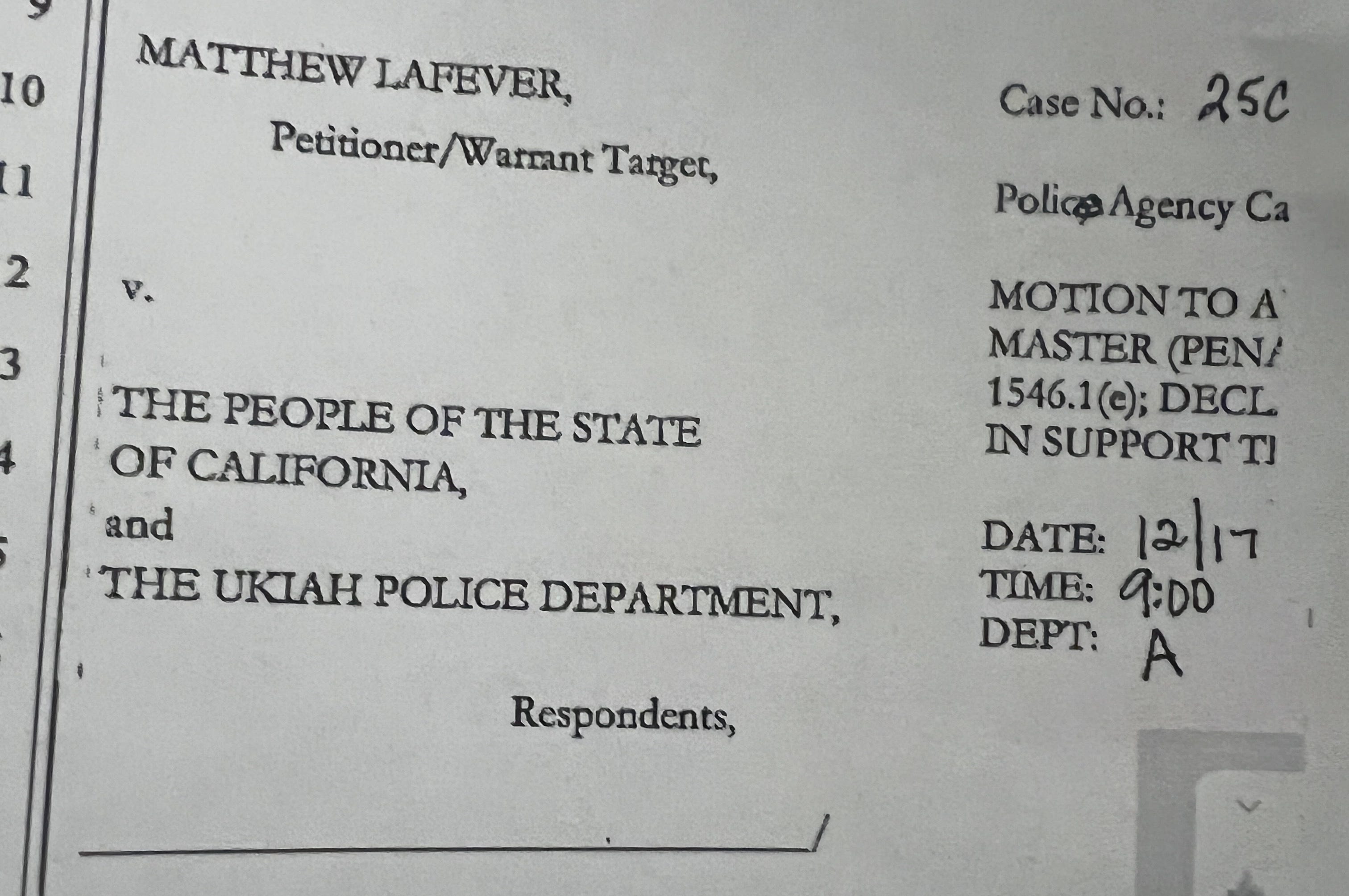 The case is listed in the court’s online system as a miscellaneous criminal petition. While the caption now reads The People of the State of California v. Matthew LaFever, a Dec. 2 motion seeking appointment of a special master retains its original styling: Matthew LaFever v. the People of the State of California and the Ukiah Police Department — as originally reported by MendoLocal.News.