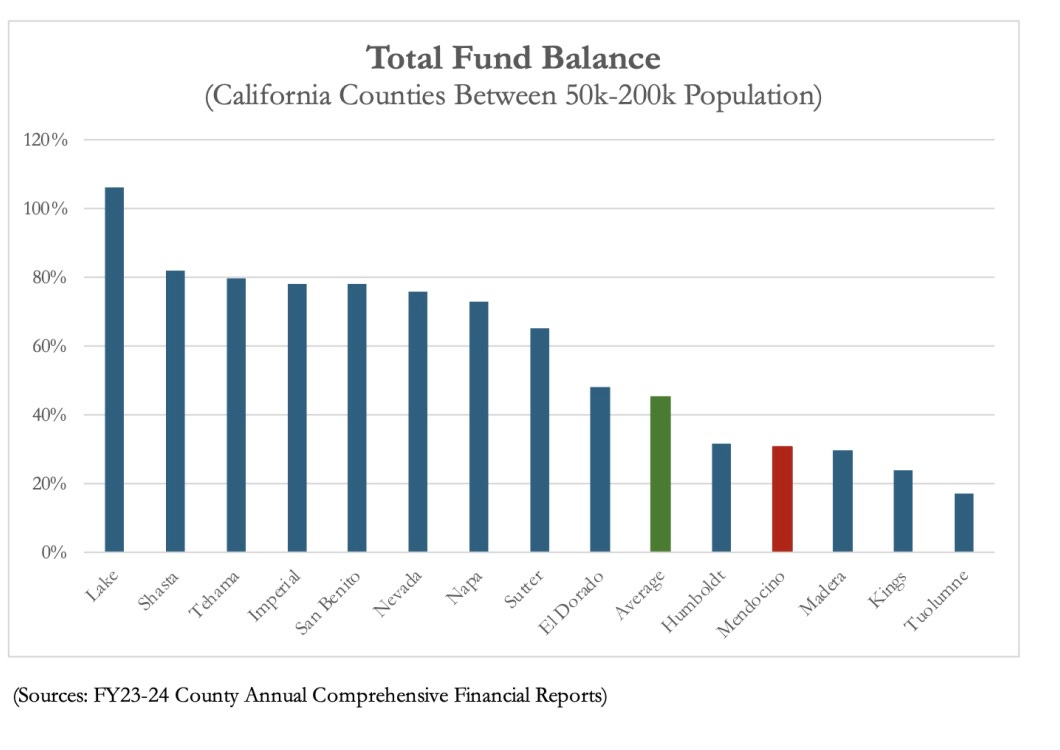 By one measure, the county lags behind its peers. Mendocino’s total fund balance ranks 10th out of 14 comparable counties and is roughly 30 percent below the average, an indicator of a relatively weak financial position.