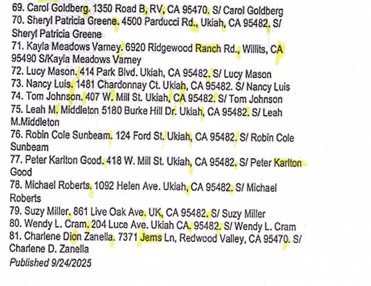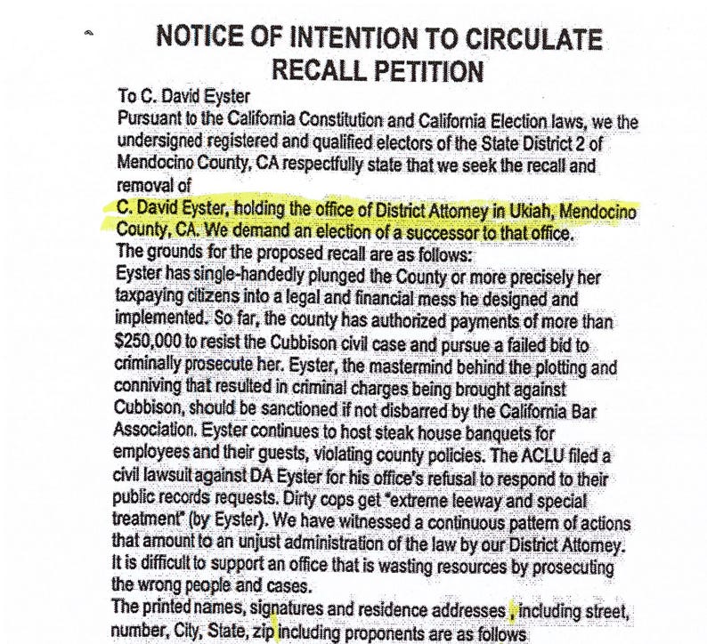 “The published Notice of Intent to Recall had several errors and did not match what was served to Mr. Eyster,” Mendocino County Registrar of Voters, Assessor, Clerk and Recorder Katrina Bartolomie said in an email to Mendo Local News.