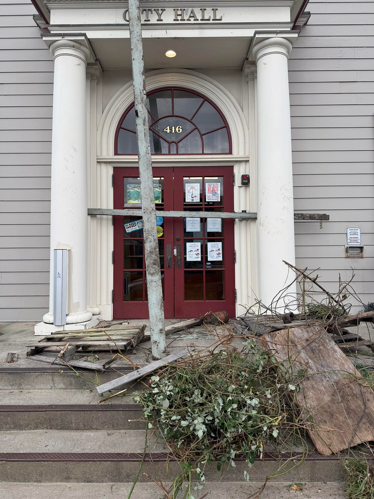 The Fort Bragg Police arrested a local personality and business owner on Sunday after he dumped a load of debris on the steps of City Hall and nailed a board across the entrance.
