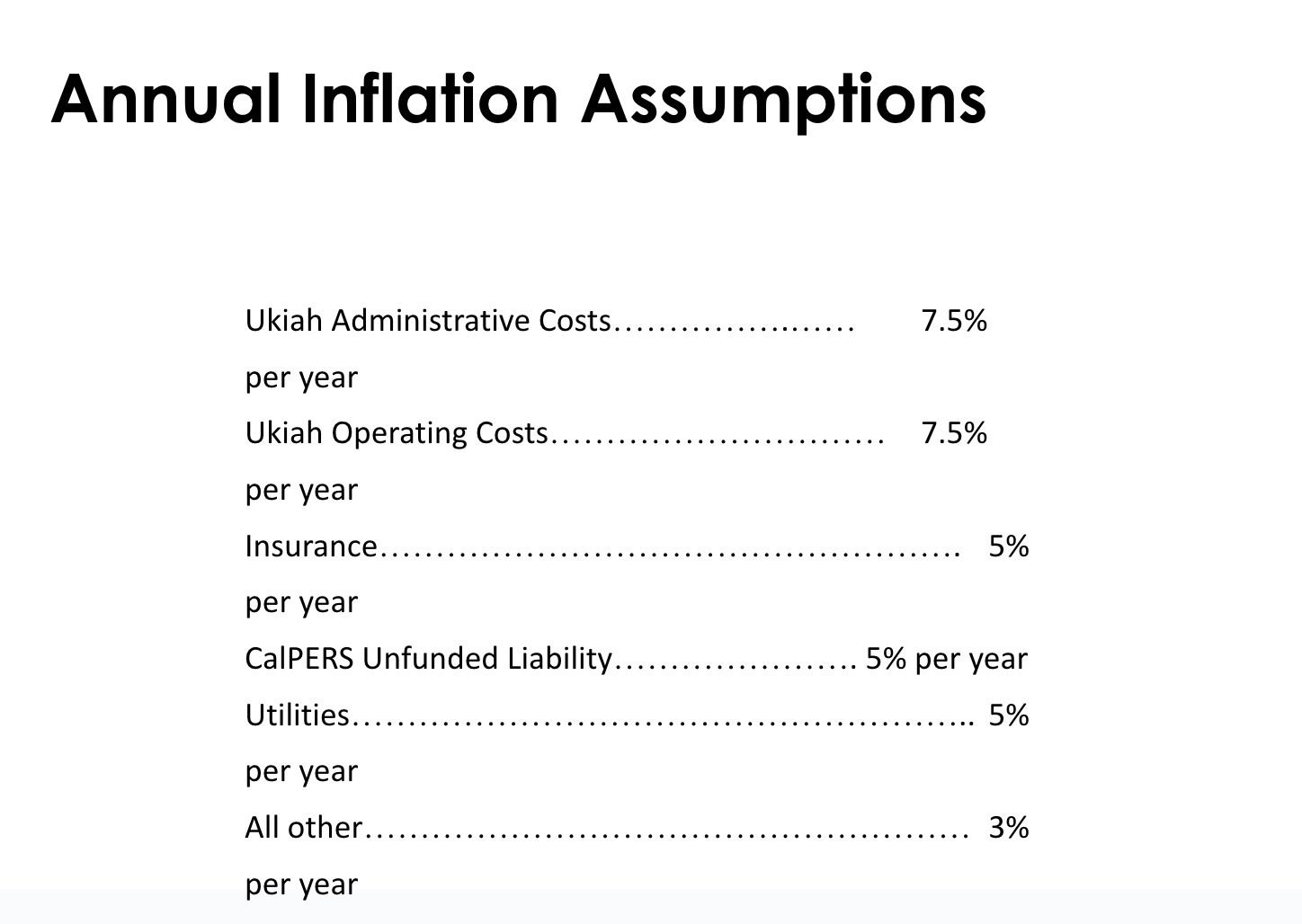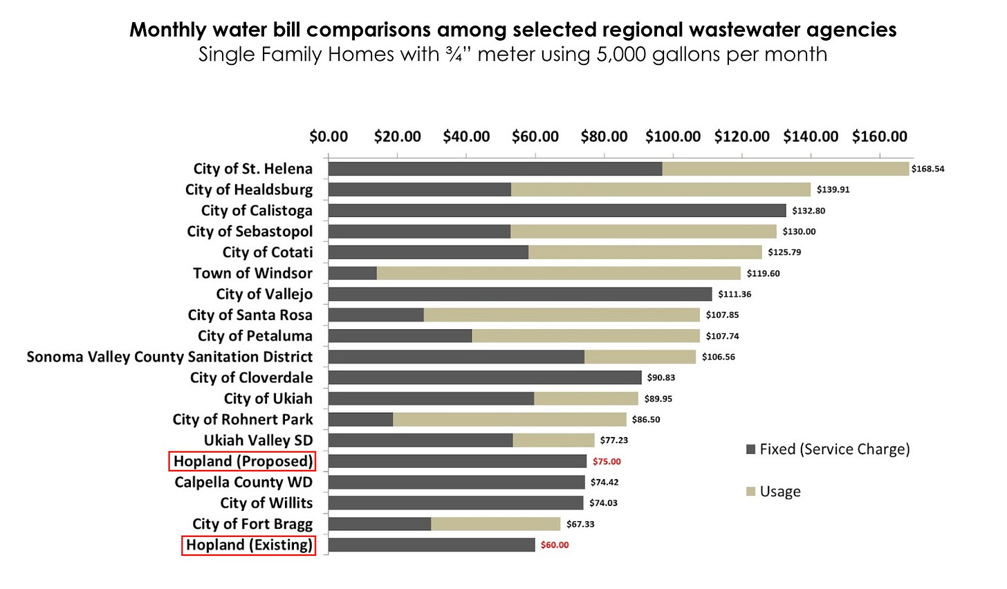 Hildebrand also displayed a chart comparing Hopland’s rates with those in Ukiah, Fort Bragg and Willits — the same presentation he used to justify a 36 percent increase in Ukiah’s rates earlier last month — that time, Ukiah was presented as having the lowest rates. This time Hopland ranked at the bottom.