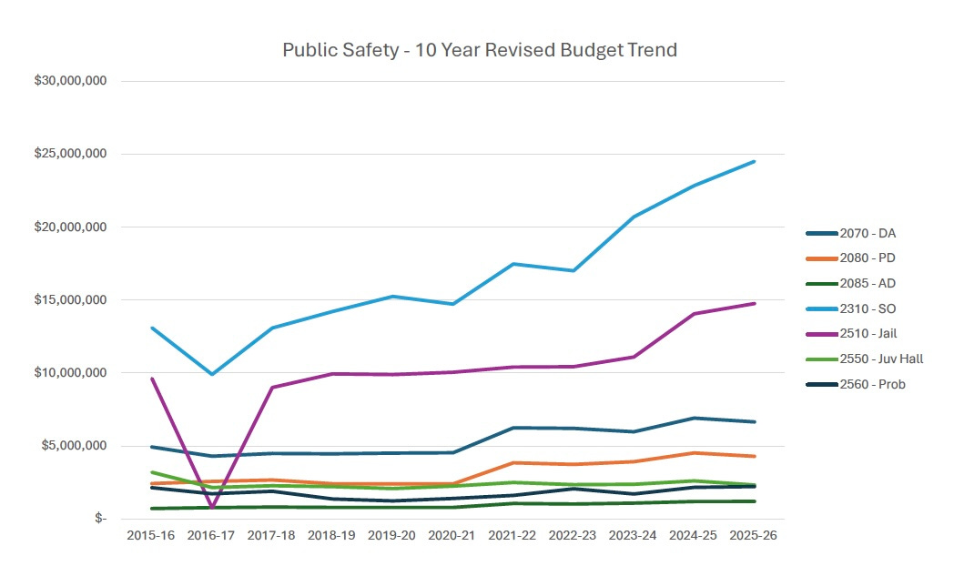 During the meeting, supervisors reviewed historical charts showing jail and sheriff spending rising steeply since Proposition 13 limited property tax growth in 1978, while road funding steadily declined.