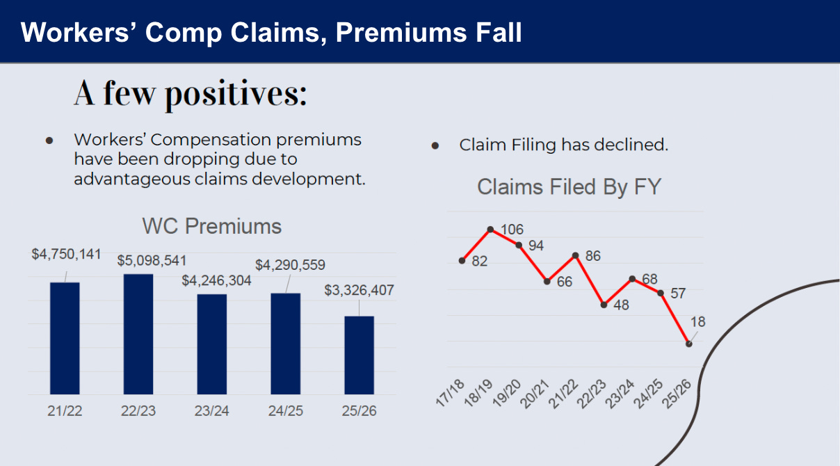 Workers’ compensation premiums for Mendocino County have declined “rather drastically,” she said, attributing the decrease to changes in claims handling and favorable claims development. New workers’ compensation claims so far this fiscal year are at a record low, she said, though she cautioned the year is only at its midpoint.