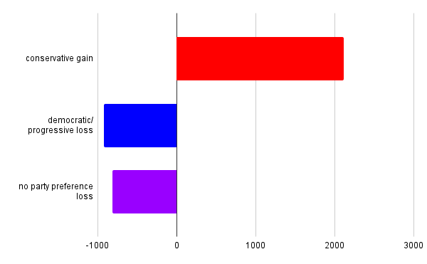 Overall, the county’s registered voter population grew slightly, increasing by 201 voters to a total of 53,898. The net shift toward more conservative parties represents about 4% of the electorate.